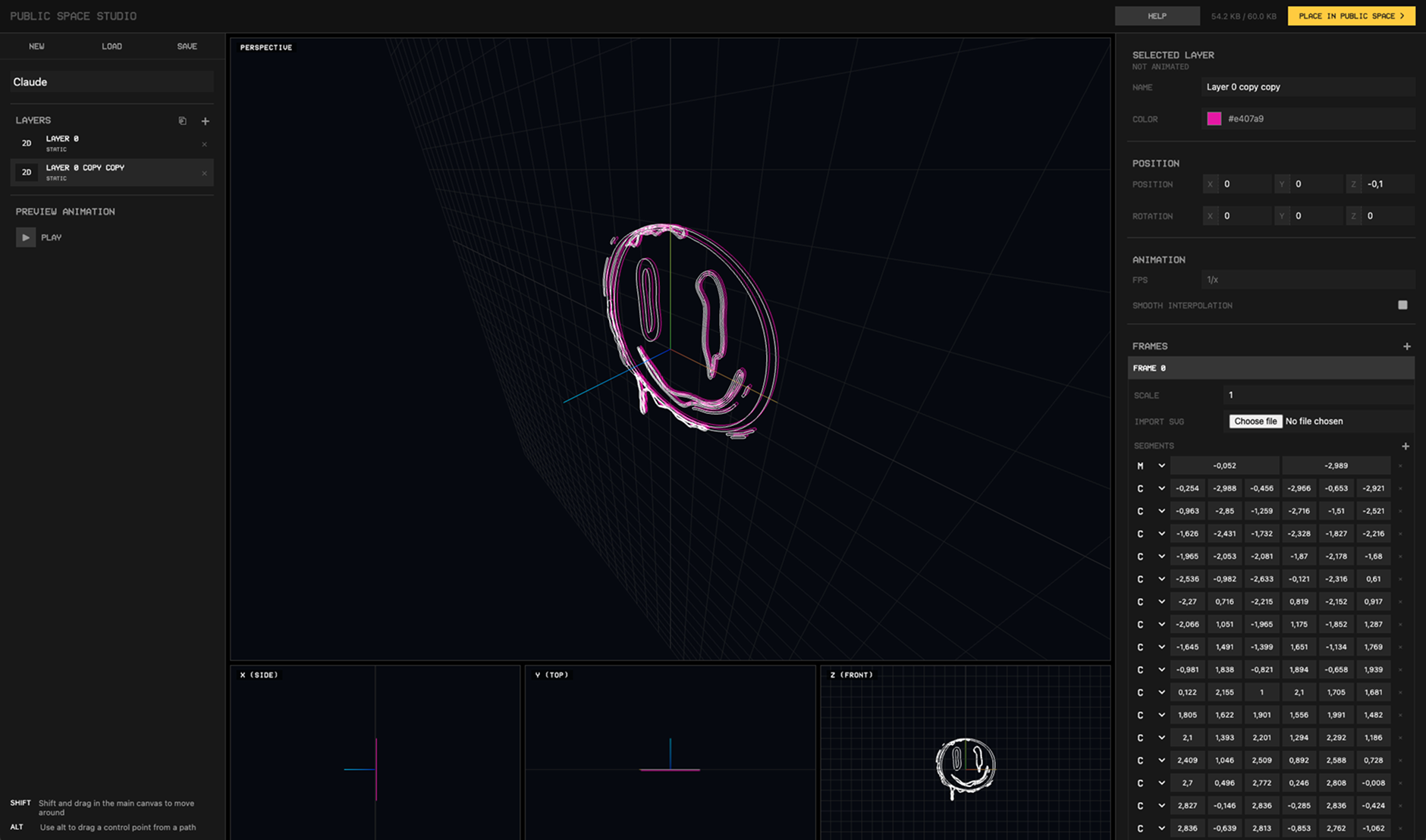 Public Space stores contributions directly on-chain using a compact binary format designed to minimize storage while remaining easy to parse. Instead of storing full SVG or JSON structures, each submission is encoded into a small binary blob that describes the drawing instructions for the piece. These instructions contain the minimal information needed to reconstruct the lines, shapes, and placement of a tag within the shared space.